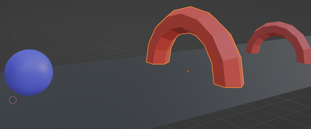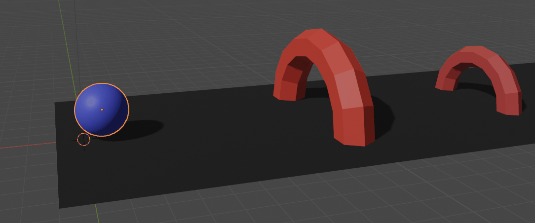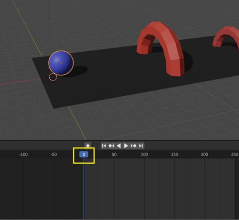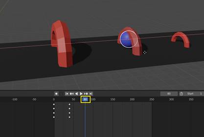 7. Переместим временную линию на 80 кадр и переместим (клавиша G) нашу сферу под второй чекпоинт. Мы видим, что сфера не пролезает под чекпоинтом.