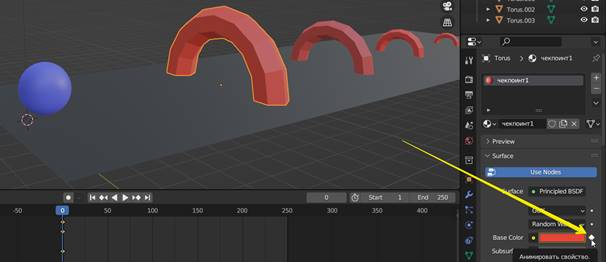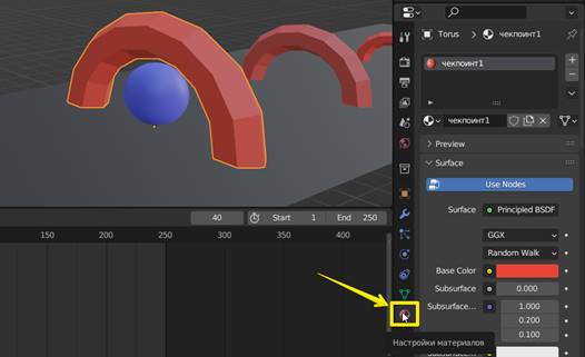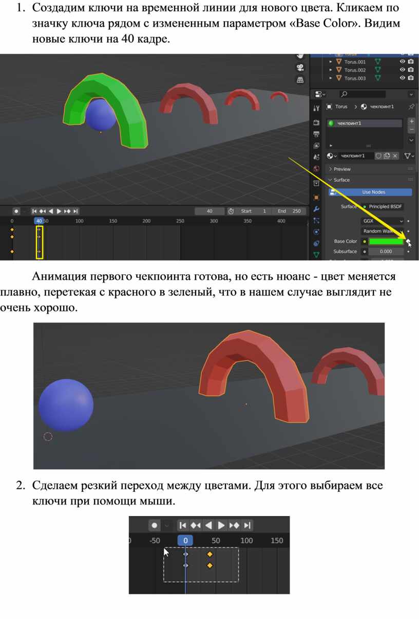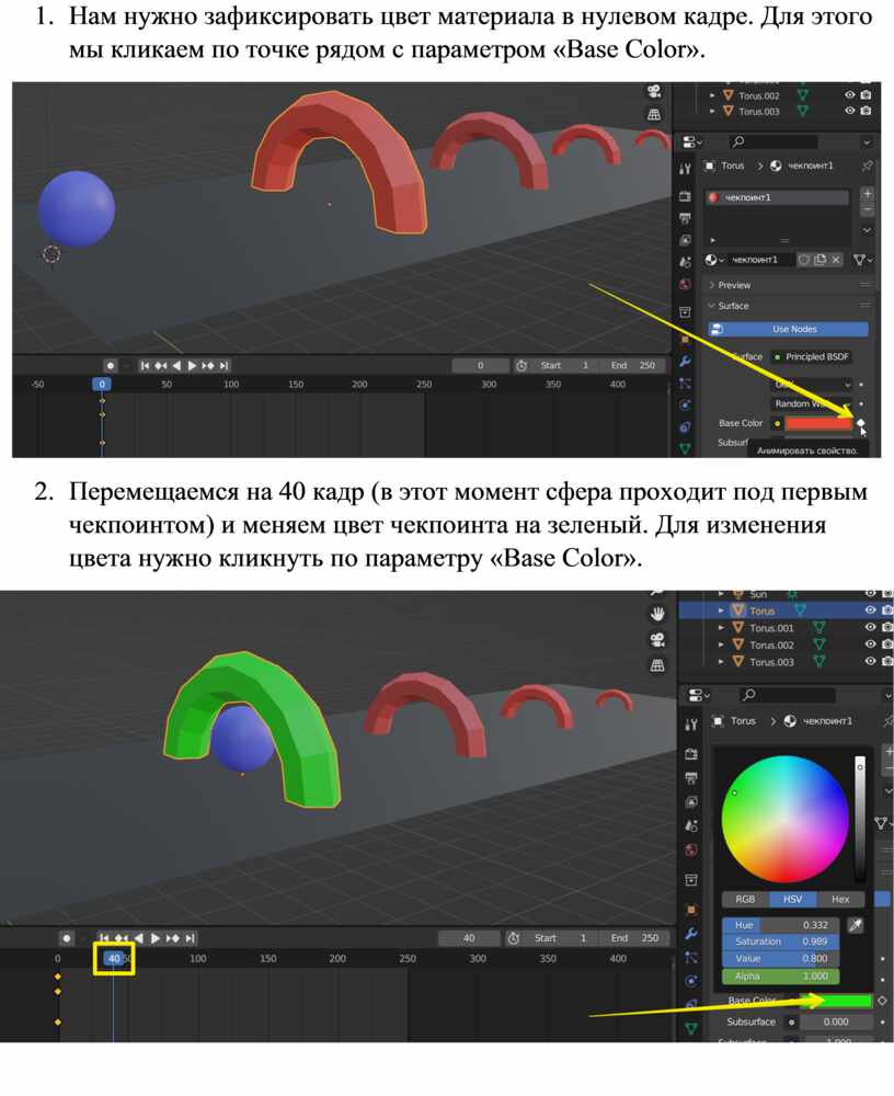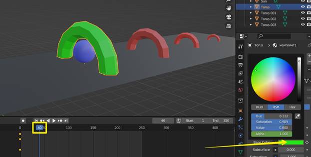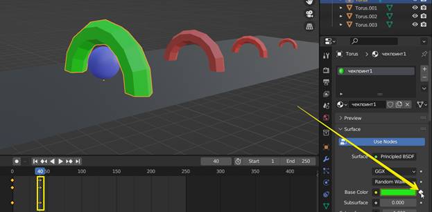 4. Перемещаемся на 40 кадр (в этот момент сфера проходит под первым чекпоинтом) и меняем цвет чекпоинта на зеленый. Для изменения цвета нужно кликнуть по параметру «Base Color».