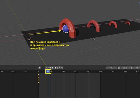 5. Переместим временную линию на 40 кадр, а затем передвинем сферу под первый чекпоинт при помощи горячей клавиши G и привязке к оси X.