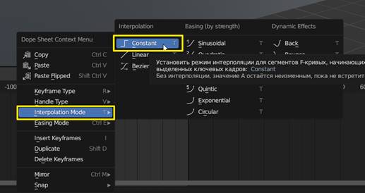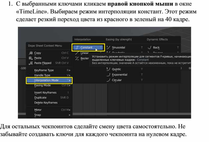7. С выбранными ключами кликаем правой кнопкой мыши в окне «TimeLine». Выбираем режим интерполяции констант. Этот режим сделает резкий переход цвета из красного в зеленый на 40 кадре.