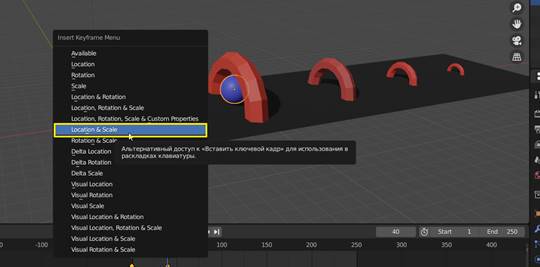 6. Зафиксируем положение и размер сферы на 40 кадре при помощи клавиши I.