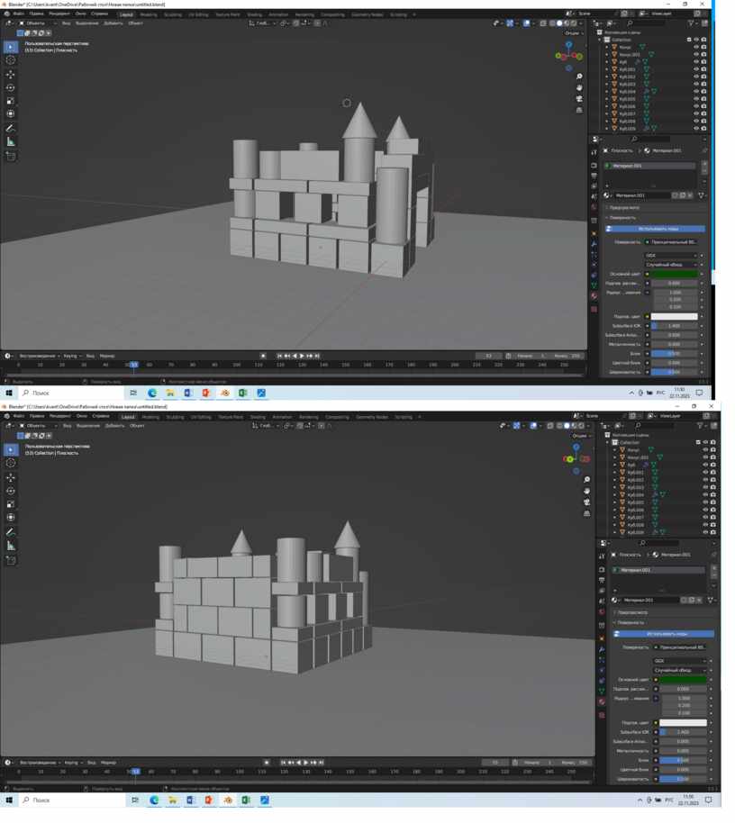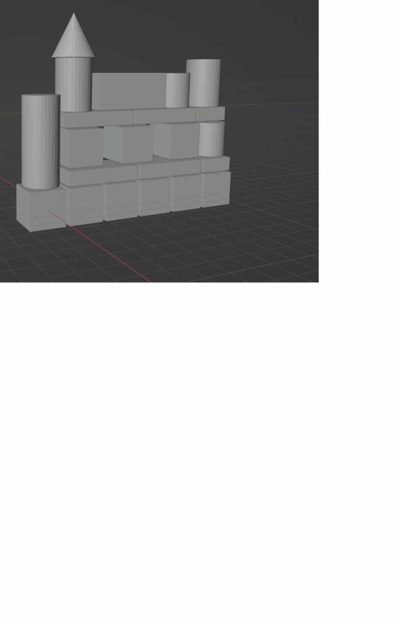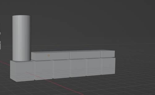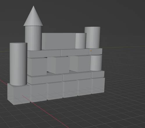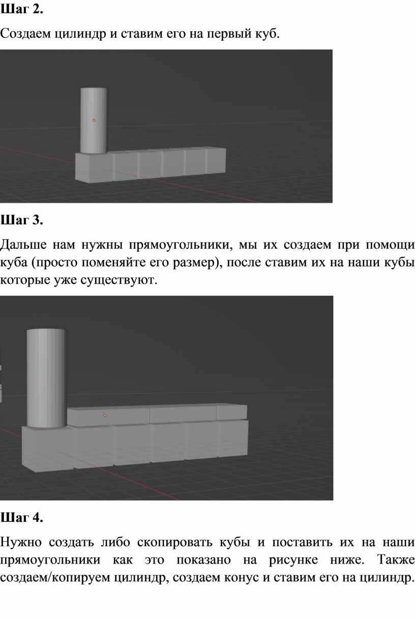 Нужно создать либо скопировать кубы и поставить их на наши прямоугольники как это показано на рисунке ниже. Также создаем/копируем цилиндр, создаем конус и ставим его на цилиндр.