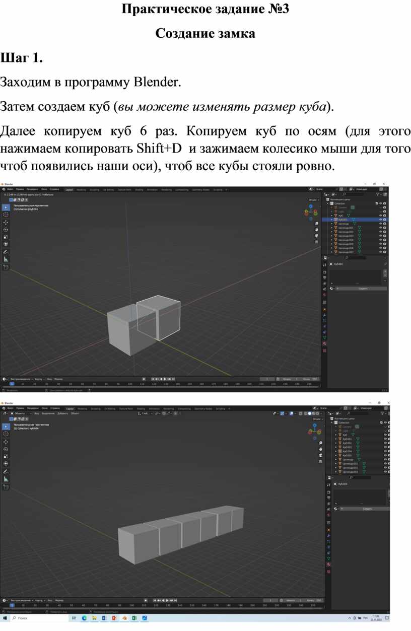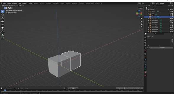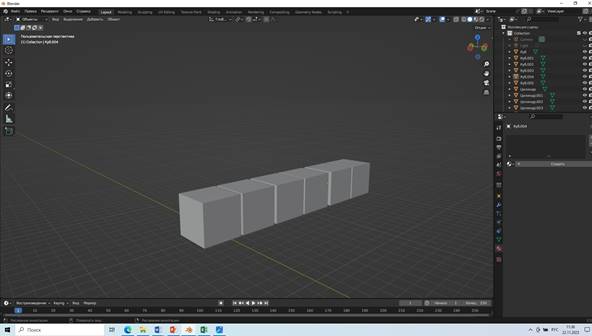 Далее копируем куб 6 раз. Копируем куб по осям (для этого нажимаем копировать Shift+D и зажимаем колесико мыши для того чтоб появились наши оси), чтоб все кубы стояли ровно.