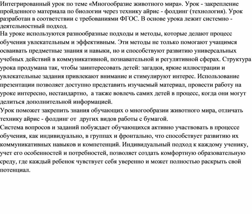 Интегрированный урок по теме «Многообразие животного мира». Урок - закрепление пройденного материала по биологии через технику айрис - фолдинг (технология). Урок разработан в соответствии с требованиями ФГОС. В основе урока лежит системно - деятельностный подход.