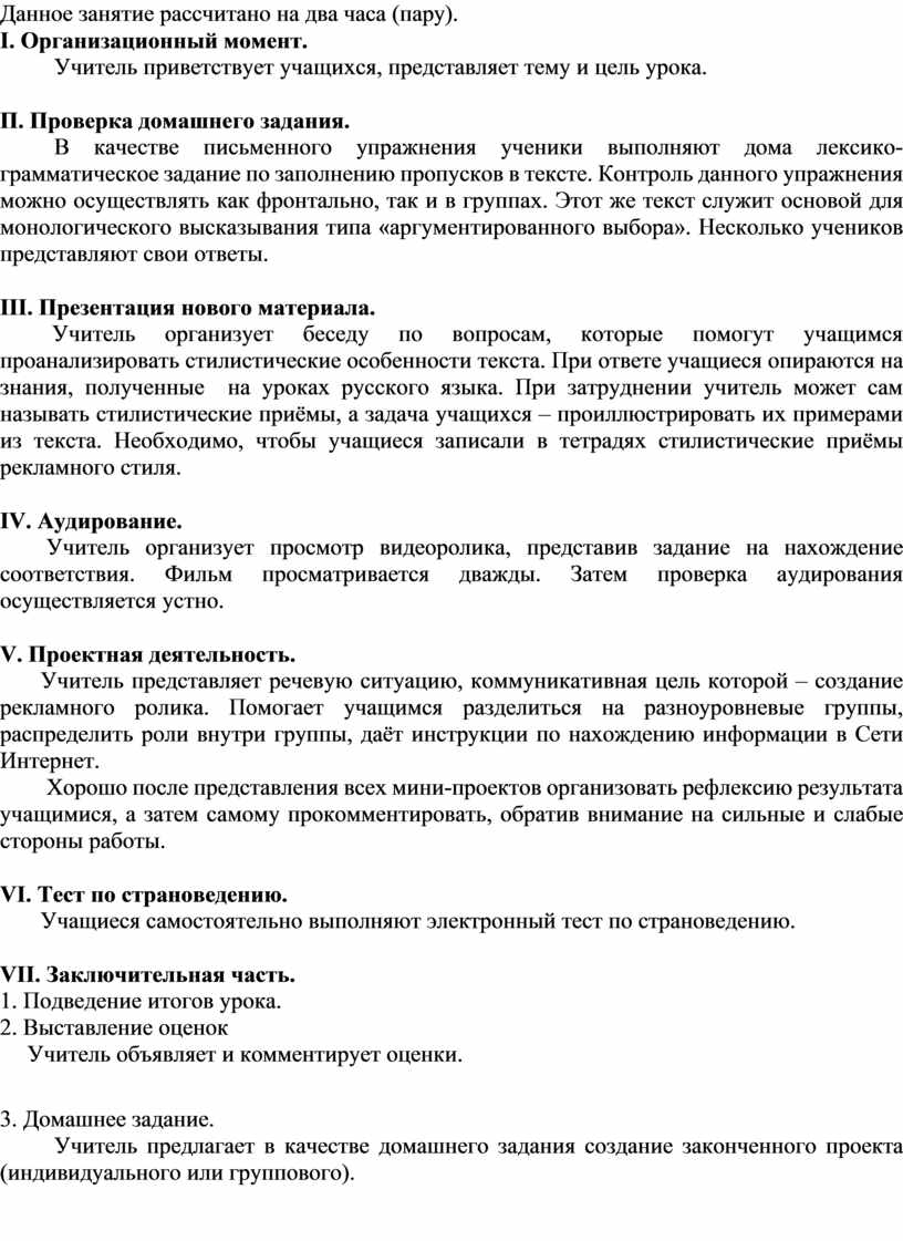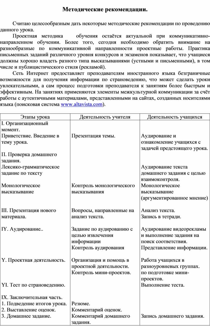 Проектная методика обучения остаётся актуальной при коммуникативно-направленном обучении. Более того, сегодня необходимо обратить внимание на разнообразные по коммуникативной направленности проектные работы. Практика письменных заданий различного уровня конкурсов и экзаменов показывает, что учащиеся должны хорошо владеть разного типа высказываниями (устными и письменными), в том числе и публицистического стиля (рекламой).