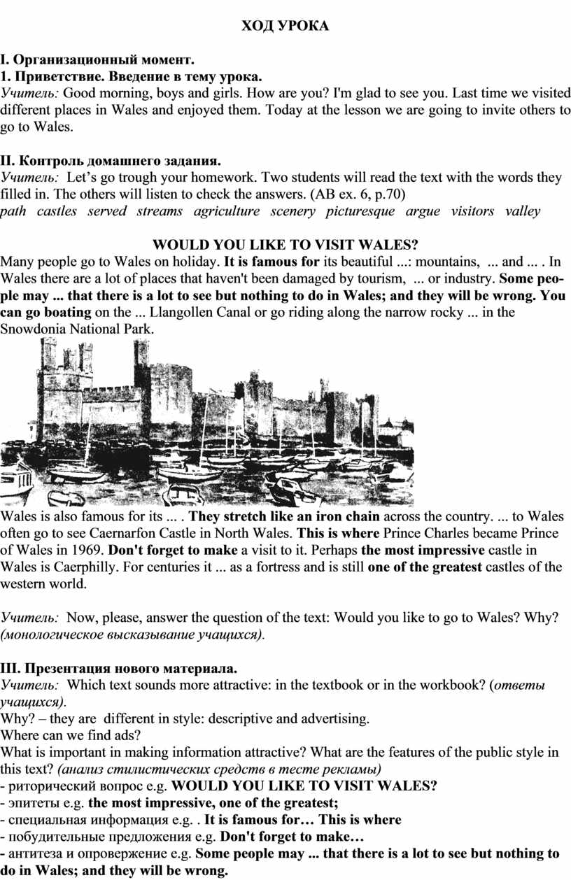 Учитель: Good morning, boys and girls. How are you? I'm glad to see you. Last time we visited different places in Wales and enjoyed them. Today at the lesson we are going to invite others to go to Wales.