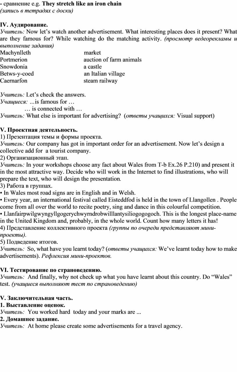 Учитель: In your workshops choose any fact about Wales from T-b Ex.26 P.210) and present it in the most attractive way. Decide who will work in the Internet to find illustrations, who will prepare the text, who will design the presentation.