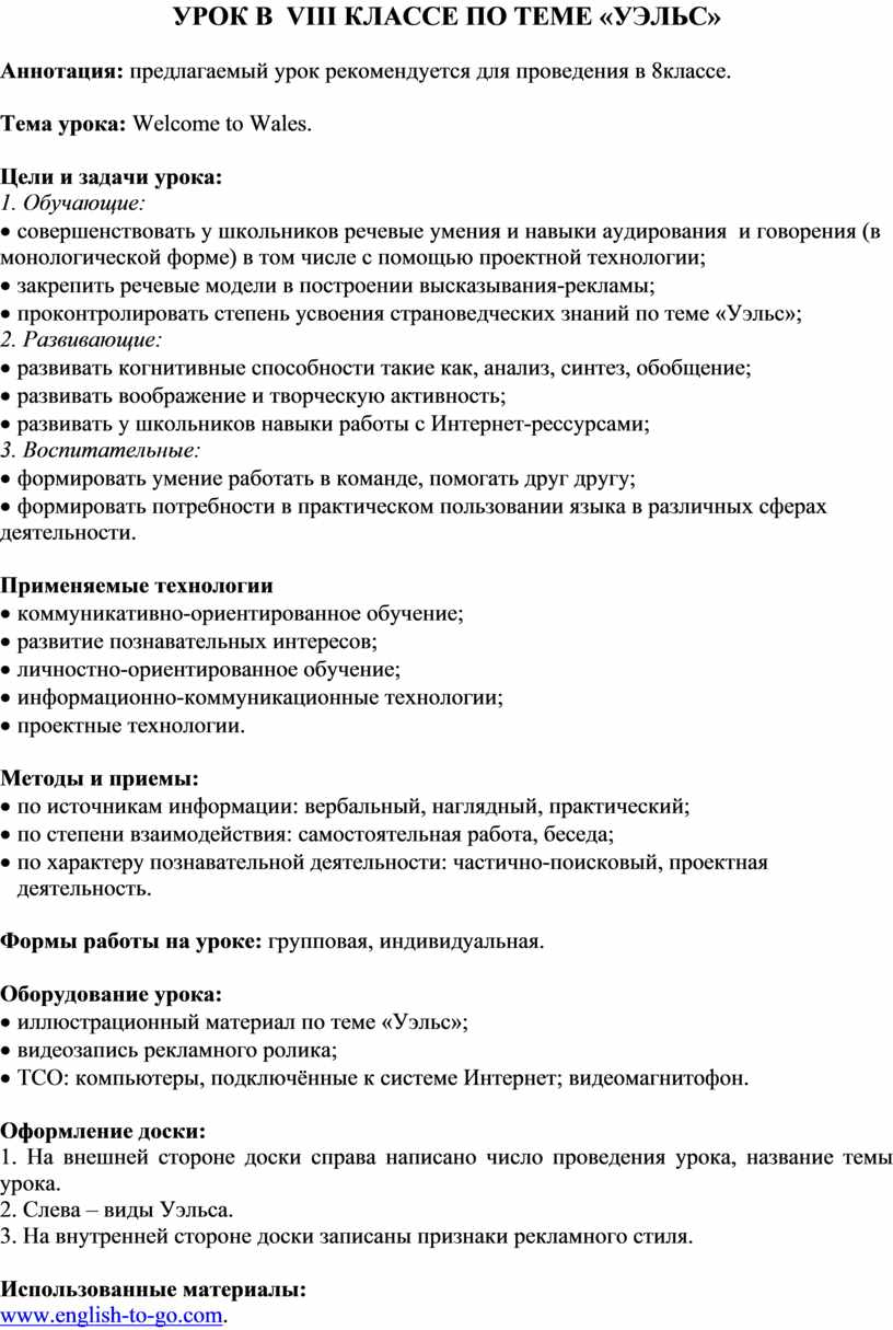 УРОК В VIII КЛАССЕ ПО ТЕМЕ «УЭЛЬС»