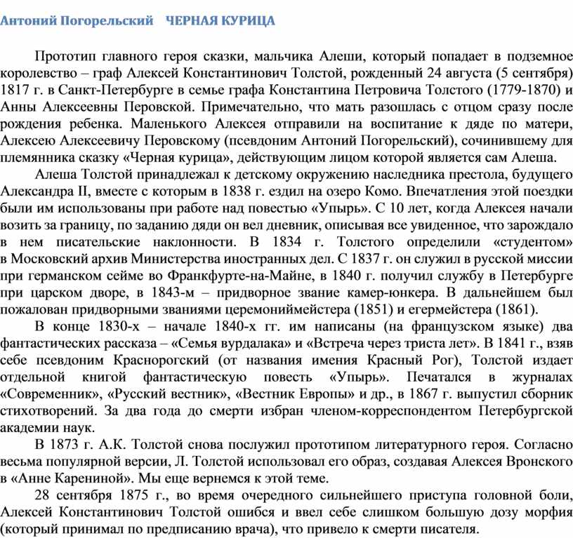 Прототип главного героя сказки, мальчика Алеши, который попадает в подземное королевство – граф Алексей Константинович Толстой, рожденный 24 августа (5 сентября) 1817 г. в Санкт-Петербурге в семье графа Константина Петровича Толстого (1779-1870) и Анны Алексеевны Перовской. Примечательно, что мать разошлась с отцом сразу после рождения ребенка. Маленького Алексея отправили на воспитание к дяде по матери, Алексею Алексеевичу Перовскому (псевдоним Антоний Погорельский), сочинившему для племянника сказку «Черная курица», действующим лицом которой является сам Алеша.