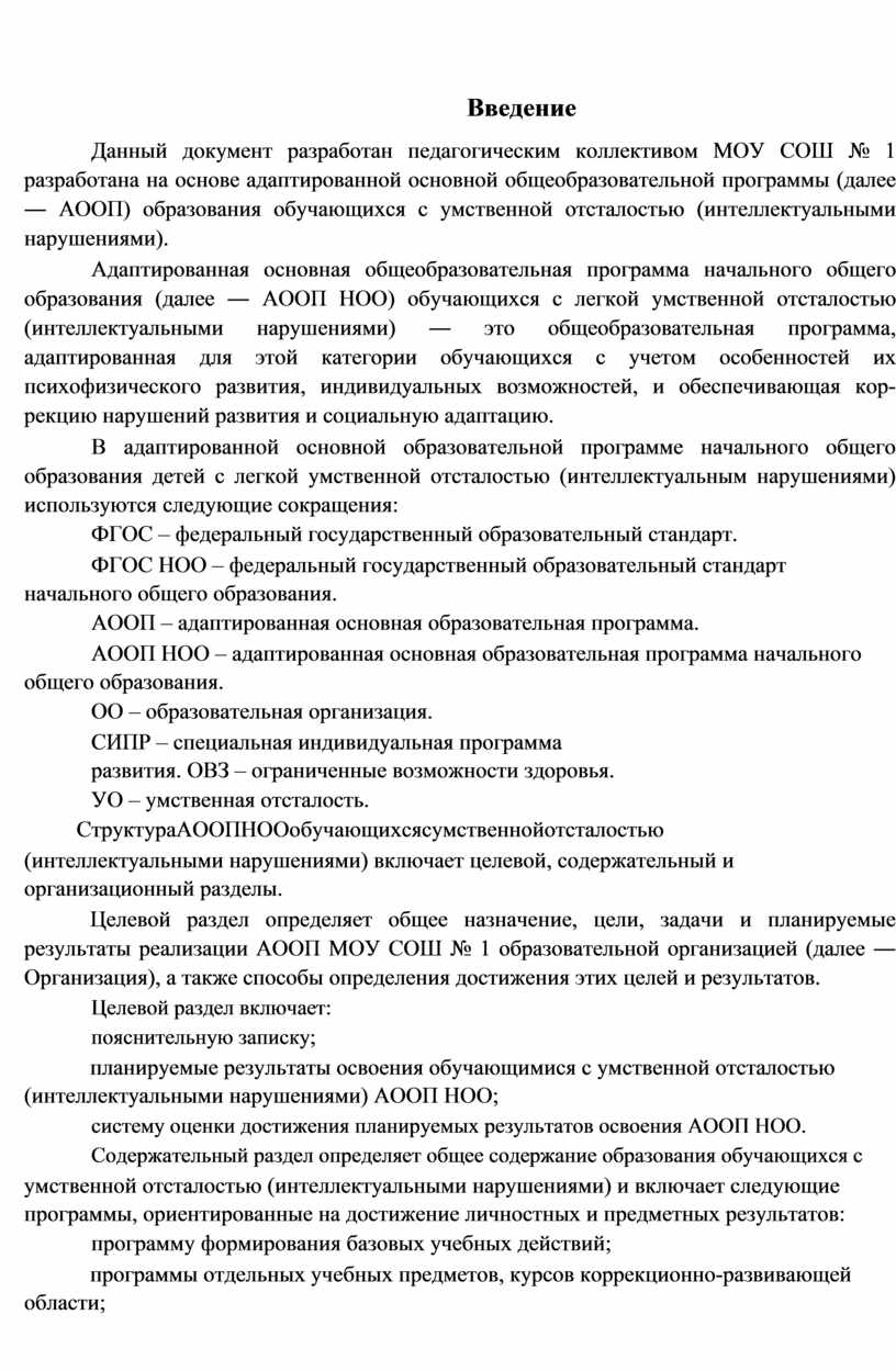 Данный документ разработан педагогическим коллективом МОУ СОШ № 1 разработана на основе адаптированной основной общеобразовательной программы (далее ― АООП) образования обучающихся с умственной отсталостью (интеллектуальными нарушениями).