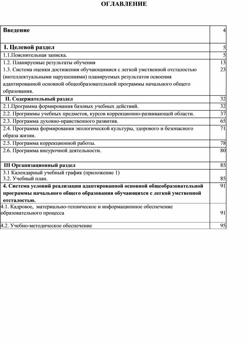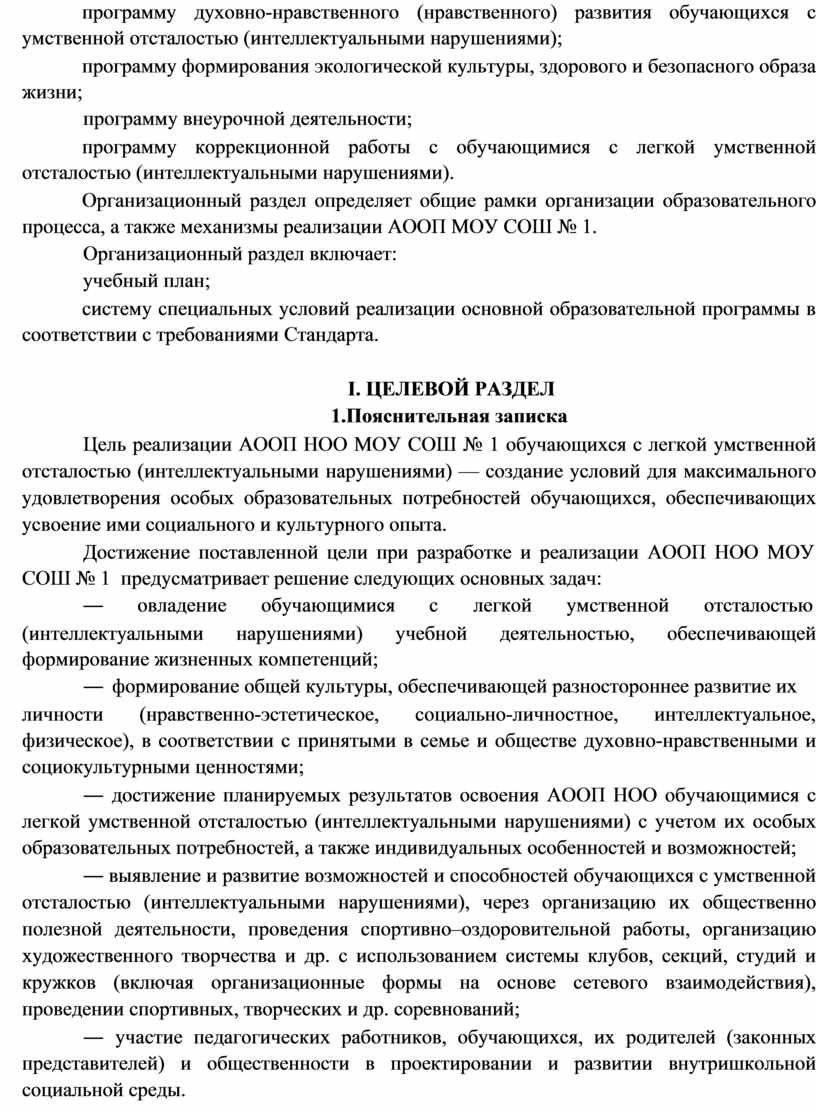 (интеллектуальными нарушениями) включает целевой, содержательный и организационный разделы.