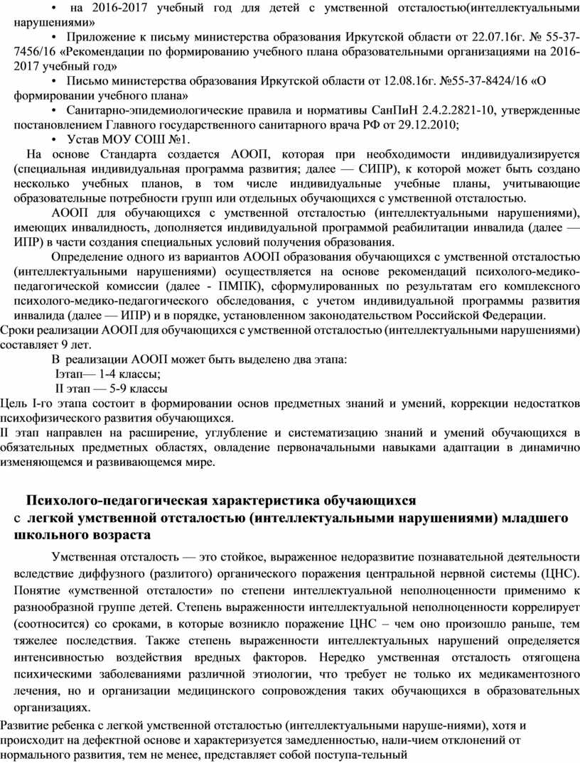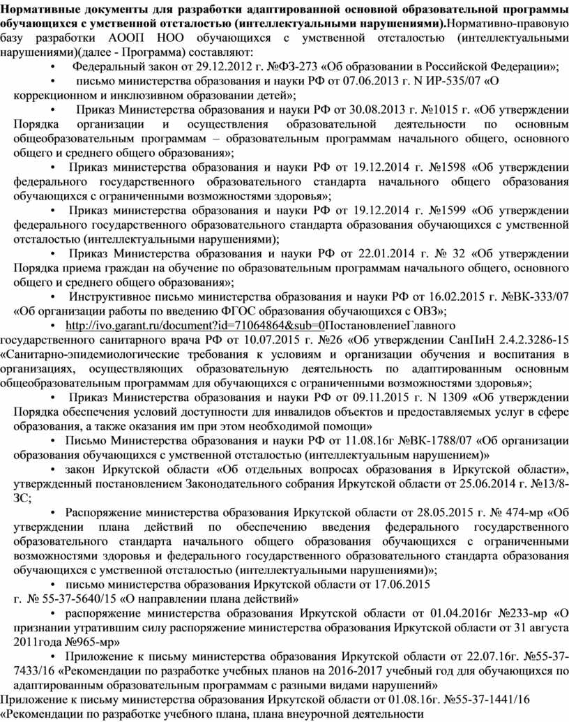 • Письмо Министерства образования и науки РФ от 11.08.16г №ВК-1788/07 «Об организации образования обучающихся с умственной отсталостью (интеллектуальным нарушением)»
