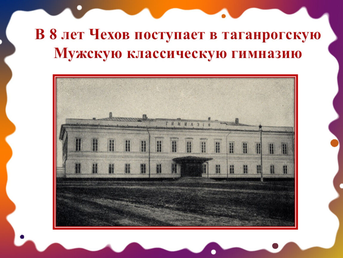 В 8 лет Чехов поступает в таганрогскую Мужскую классическую гимназию