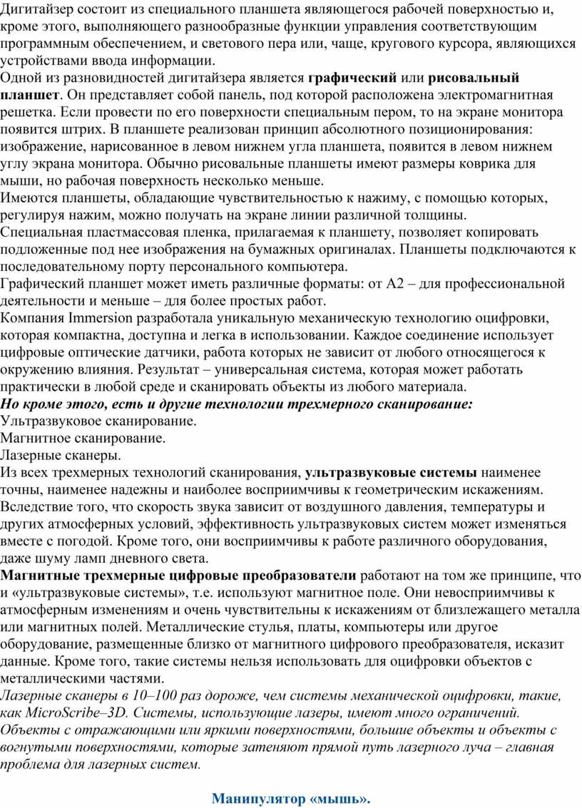 Дигитайзер состоит из специального планшета являющегося рабочей поверхностью и, кроме этого, выполняющего разнообразные функции управления соответствующим программным обеспечением, и светового пера или, чаще, кругового курсора, являющихся устройствами ввода информации.