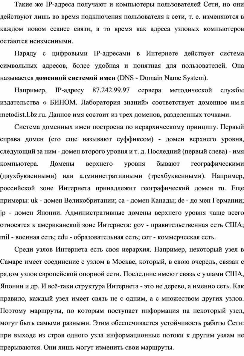 Например, IР-адресу 87.242.99.97 сервера методической службы издательства « БИНОМ. Лаборатория знаний» соответствует доменное им.я metodist.Lbz.ru. Данное имя состоит из трех доменов, разделенных точками.