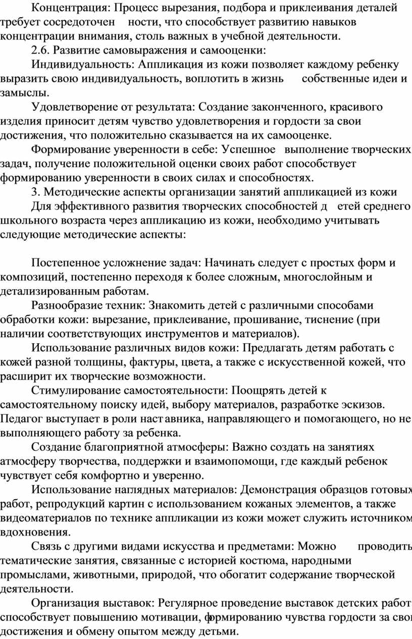 Для эффективного развития творческих способностей детей среднего школьного возраста через аппликацию из кожи, необходимо учитывать следующие методические аспекты: