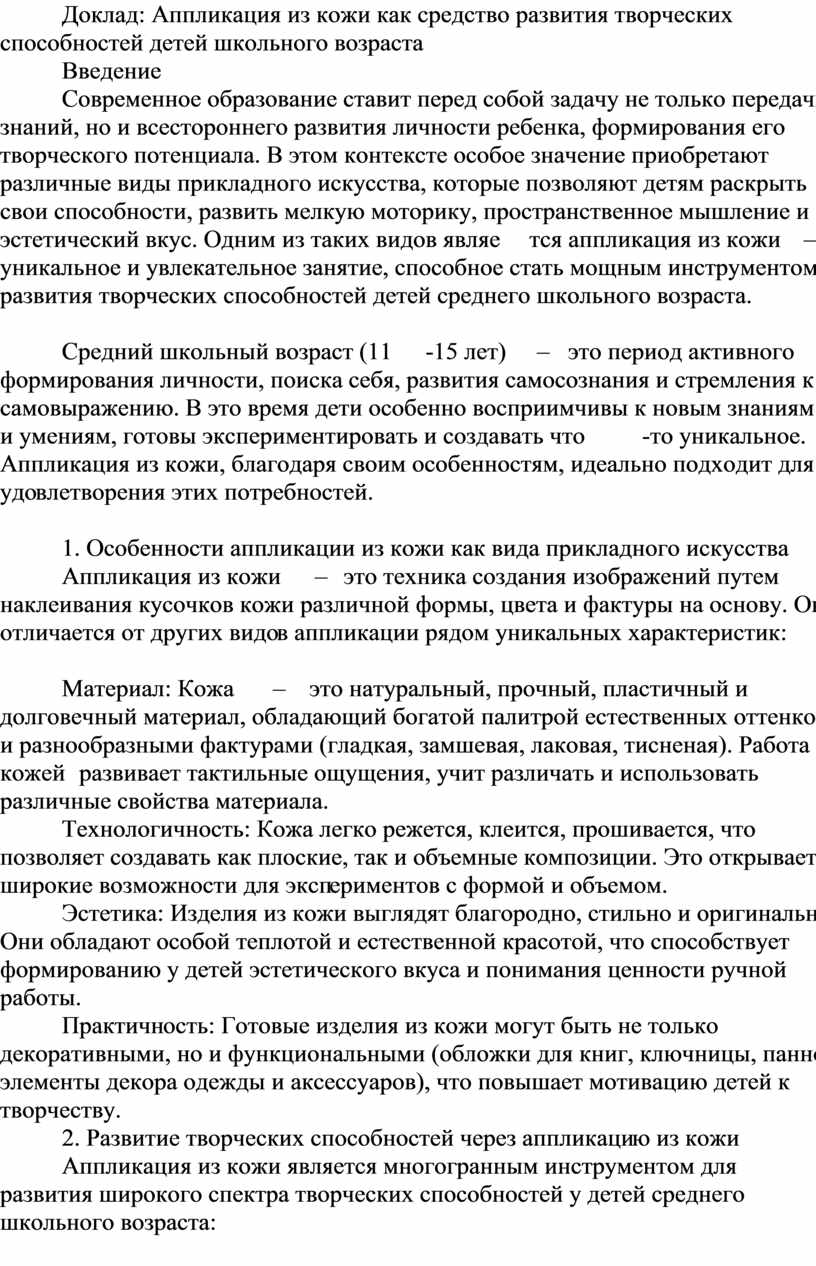 Доклад: Аппликация из кожи как средство развития творческих способностей детей школьного возраста