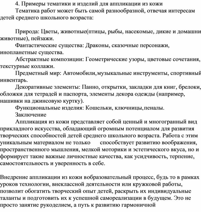 Аппликация из кожи является многогранным инструментом для развития широкого спектра творческих способностей у детей среднего школьного возраста: