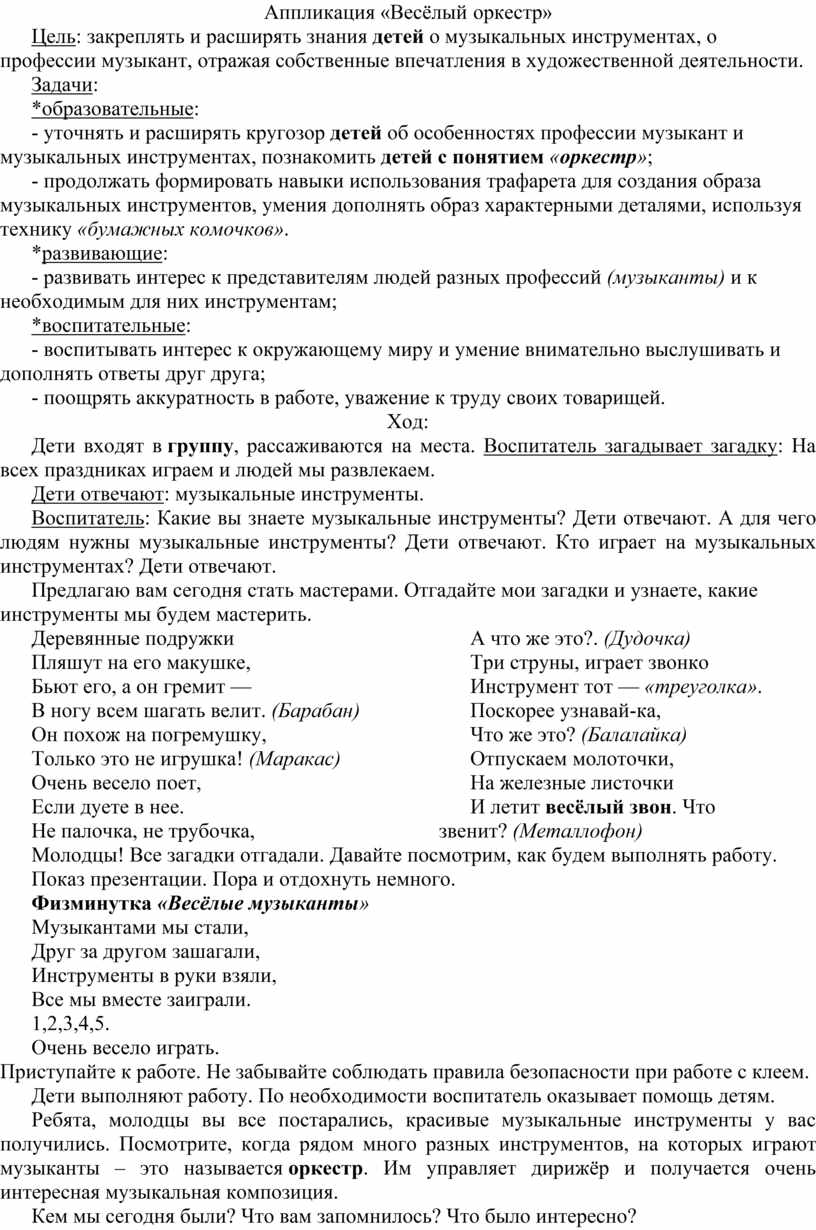 Цель: закреплять и расширять знания детей о музыкальных инструментах, о профессии музыкант, отражая собственные впечатления в художественной деятельности.