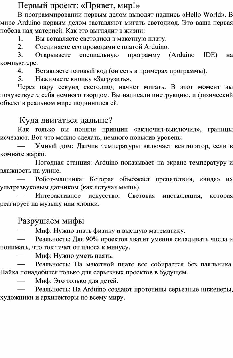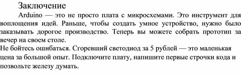 Не бойтесь ошибаться. Сгоревший светодиод за 5 рублей — это маленькая цена за большой опыт. Подключите плату, напишите первые строчки кода и позвольте железу думать.