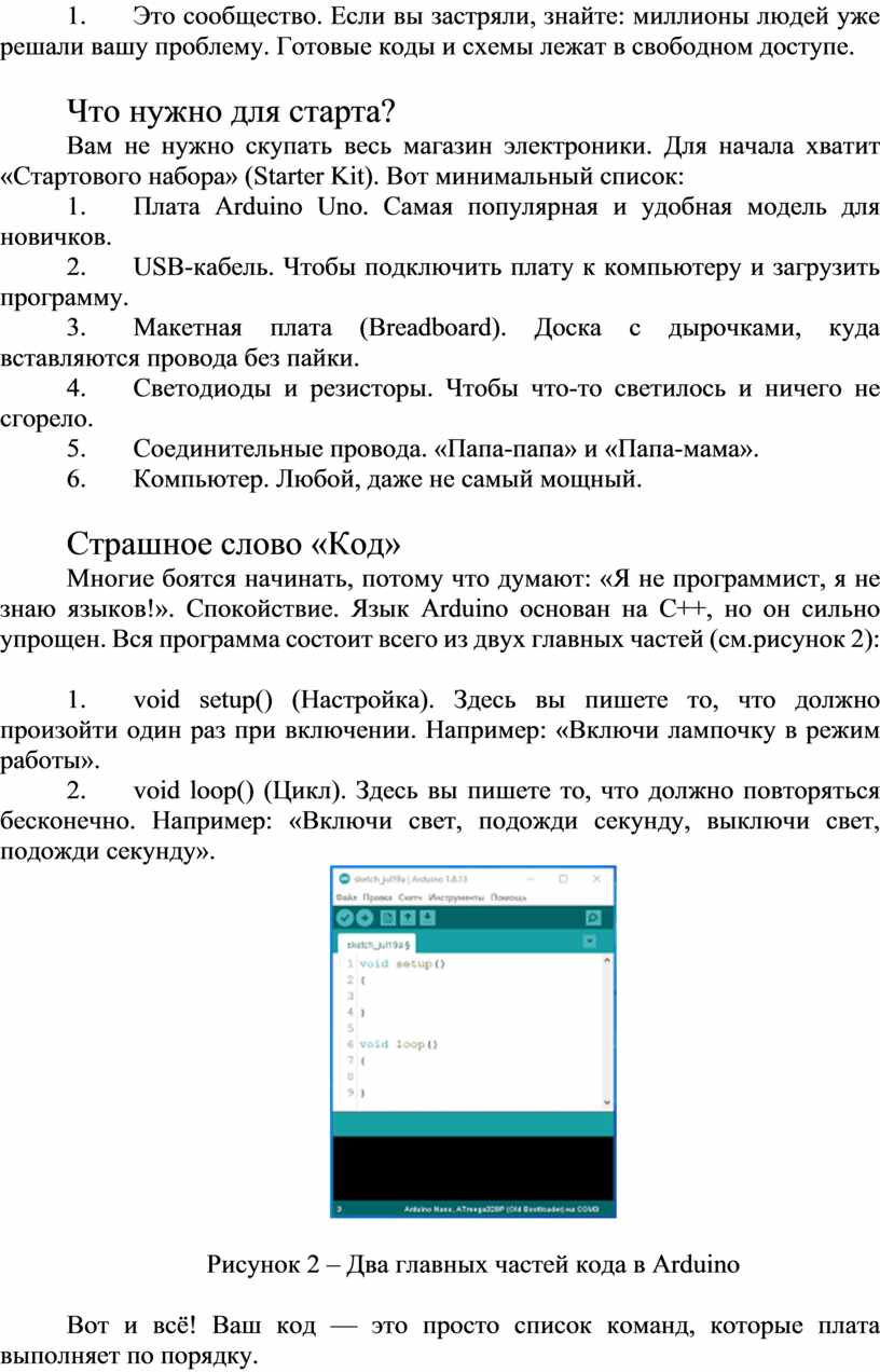 Многие боятся начинать, потому что думают: «Я не программист, я не знаю языков!». Спокойствие. Язык Arduino основан на C++, но он сильно упрощен. Вся программа состоит всего из двух главных частей (см.рисунок 2):