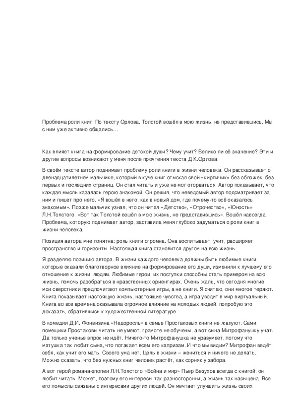 книгой.Проблема роли книг. По тексту Орлова. Толстой вошёл в мою жизнь, не представившись. Мы