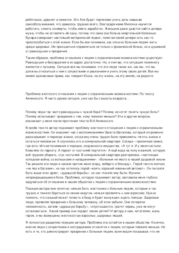 Почему люди так часто равнодушны к чужой беде? Почему из-за бытовых мелочей воюют с инвалидом, не проявляя к нему ни малейшего сострадания и сочувствия? Как остаться хорошим человеком в этой карликовой войне? Эти и другие вопросы возникают у меня после прочтения текста В.И.Амлинского.егэ
