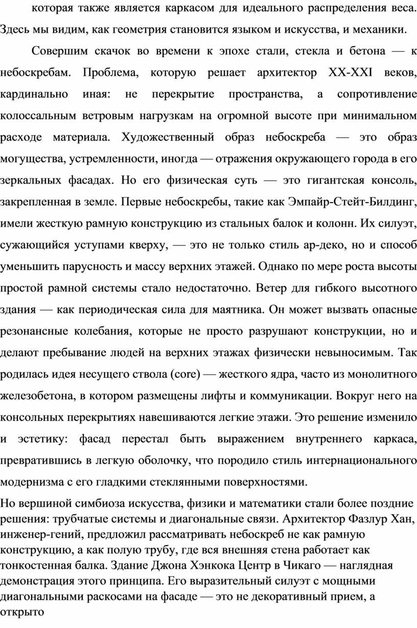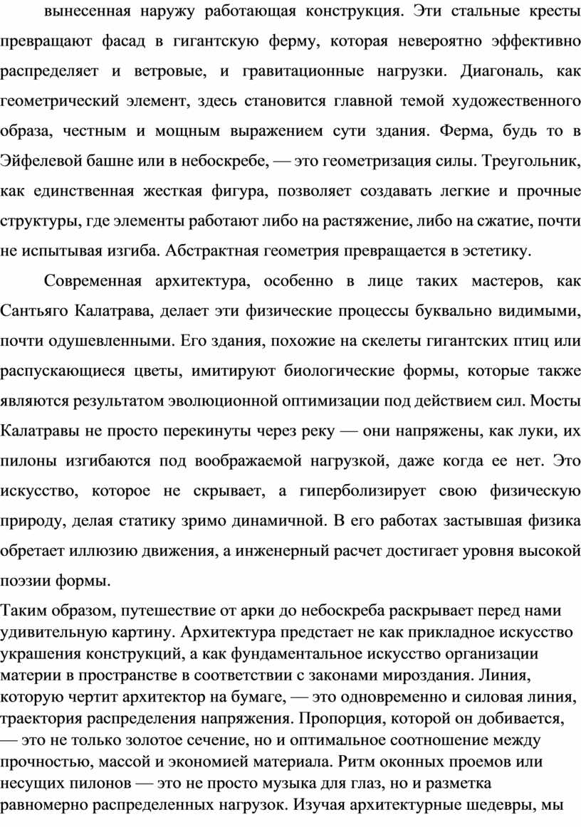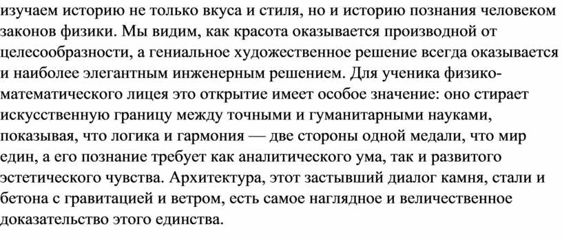Таким образом, путешествие от арки до небоскреба раскрывает перед нами удивительную картину. Архитектура предстает не как прикладное искусство украшения конструкций, а как фундаментальное искусство организации материи в пространстве в соответствии с законами мироздания. Линия, которую чертит архитектор на бумаге, — это одновременно и силовая линия, траектория распределения напряжения. Пропорция, которой он добивается, — это не только золотое сечение, но и оптимальное соотношение между прочностью, массой и экономией материала. Ритм оконных проемов или несущих пилонов — это не просто музыка для глаз, но и разметка равномерно распределенных нагрузок. Изучая архитектурные шедевры, мы изучаем историю не только вкуса и стиля, но и историю познания человеком законов физики. Мы видим, как красота оказывается производной от целесообразности, а гениальное художественное решение всегда оказывается и наиболее элегантным инженерным решением. Для ученика физико-математического лицея это открытие имеет особое значение: оно стирает искусственную границу между точными и гуманитарными науками, показывая, что логика и гармония — две стороны одной медали, что мир един, а его познание требует как аналитического ума, так и развитого эстетического чувства. Архитектура, этот застывший диалог камня, стали и бетона с гравитацией и ветром, есть самое наглядное и величественное доказательство этого единства.