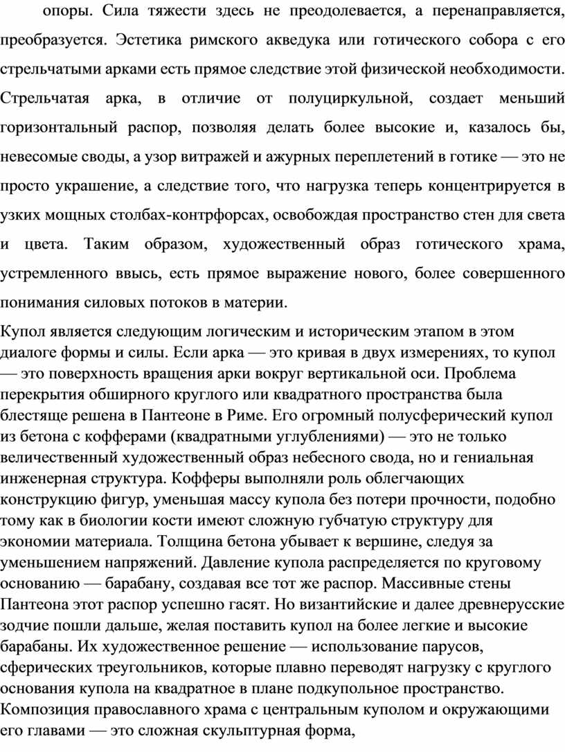 Купол является следующим логическим и историческим этапом в этом диалоге формы и силы. Если арка — это кривая в двух измерениях, то купол — это поверхность вращения арки вокруг вертикальной оси. Проблема перекрытия обширного круглого или квадратного пространства была блестяще решена в Пантеоне в Риме. Его огромный полусферический купол из бетона с кофферами (квадратными углублениями) — это не только величественный художественный образ небесного свода, но и гениальная инженерная структура. Кофферы выполняли роль облегчающих конструкцию фигур, уменьшая массу купола без потери прочности, подобно тому как в биологии кости имеют сложную губчатую структуру для экономии материала. Толщина бетона убывает к вершине, следуя за уменьшением напряжений. Давление купола распределяется по круговому основанию — барабану, создавая все тот же распор. Массивные стены Пантеона этот распор успешно гасят. Но византийские и далее древнерусские зодчие пошли дальше, желая поставить купол на более легкие и высокие барабаны. Их художественное решение — использование парусов, сферических треугольников, которые плавно переводят нагрузку с круглого основания купола на квадратное в плане подкупольное пространство. Композиция православного храма с центральным куполом и окружающими его главами — это сложная скульптурная форма, которая также является каркасом для идеального распределения веса. Здесь мы видим, как геометрия становится языком и искусства, и механики.