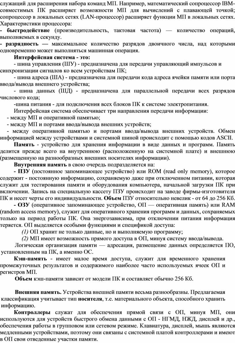 Кэш-память - имеет малое время доступа, служит для временного хранения промежуточных результатов и содержимого наиболее часто используемых ячеек ОП и регистров МП.