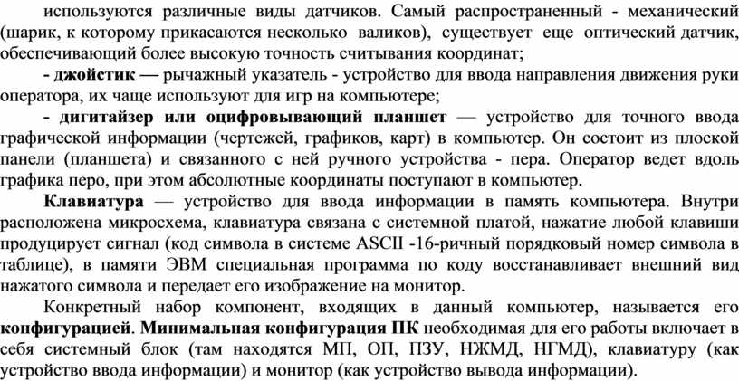 Конкретный набор компонент, входящих в данный компьютер, называется его конфигурацией. Минимальная конфигурация ПК необходимая для его работы включает в себя системный блок (там находятся МП, ОП, ПЗУ, НЖМД, НГМД), клавиатуру (как устройство ввода информации) и монитор (как устройство вывода информации).