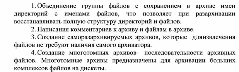 3. Объединение группы файлов с сохранением в архиве имен директорий с именами файлов, что позволяет при разархивации восстанавливать полную структуру директорий и файлов.