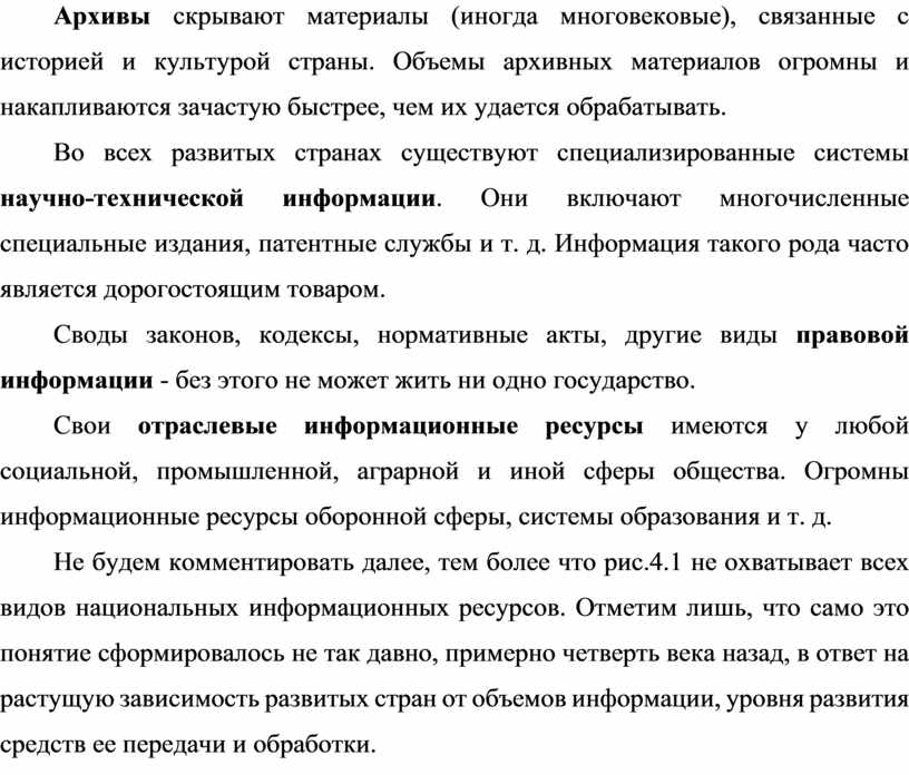 Не будем комментировать далее, тем более что рис.4.1 не охватывает всех видов национальных информационных ресурсов. Отметим лишь, что само это понятие сформировалось не так давно, примерно четверть века назад, в ответ на растущую зависимость развитых стран от объемов информации, уровня развития средств ее передачи и обработки.
