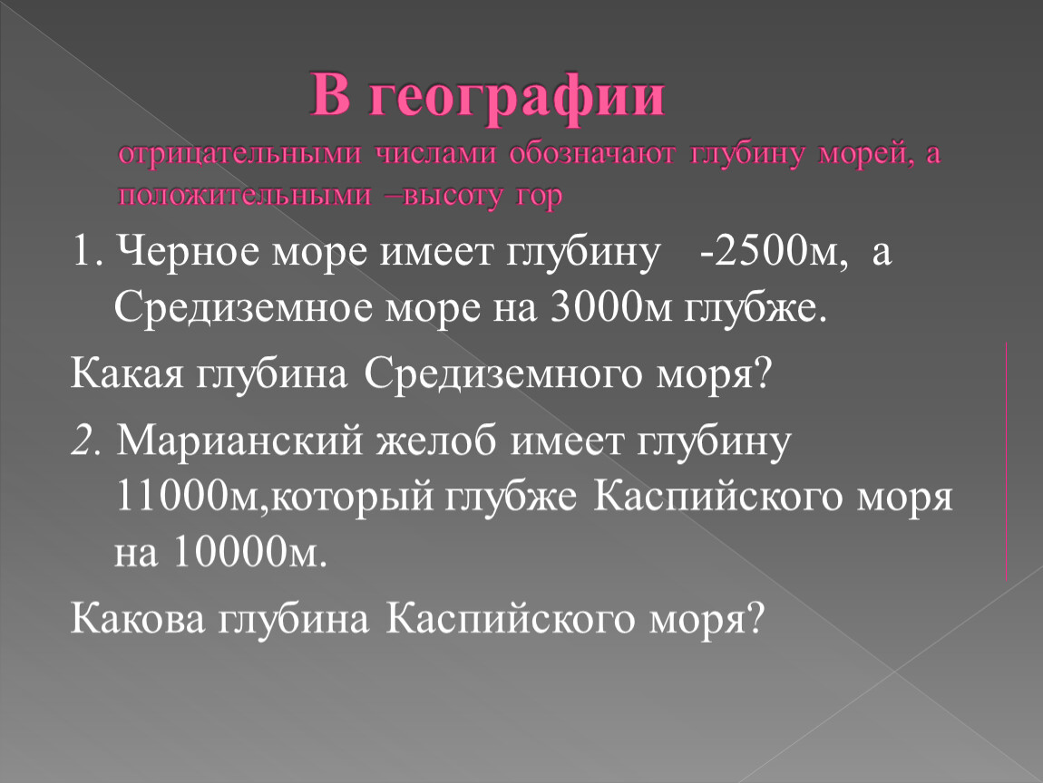 1. Черное море имеет глубину -2500м, а Средиземное море на 3000м глубже.