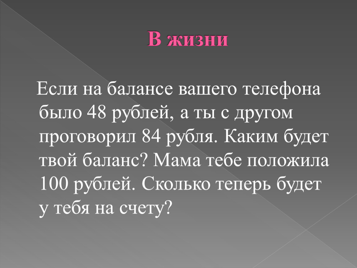 Если на балансе вашего телефона было 48 рублей, а ты с другом проговорил 84 рубля. Каким будет твой баланс? Мама тебе положила 100 рублей. Сколько теперь будет у тебя на счету?