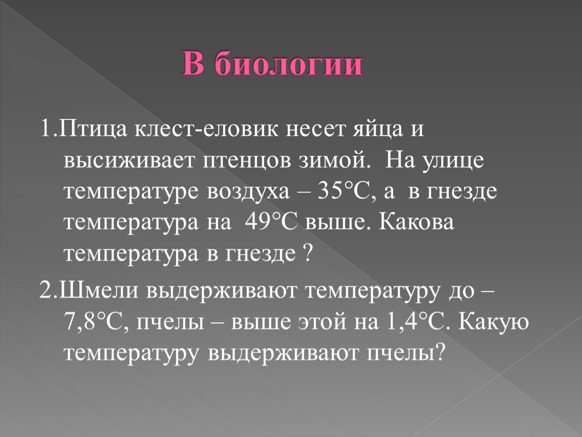 1.Птица клест-еловик несет яйца и высиживает птенцов зимой. На улице температуре воздуха – 35°С, а в гнезде температура на 49°С выше. Какова температура в гнезде ?