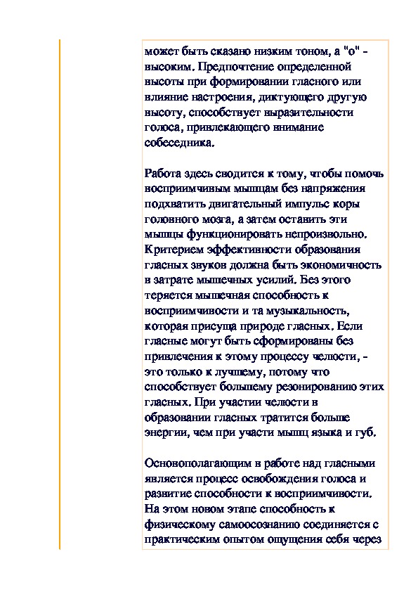 Работа здесь сводится к тому, чтобы помочь восприимчивым мышцам без напряжения подхватить двигательный импульс коры головного мозга, а затем оставить эти мышцы функционировать непроизвольно. Критерием эффективности образования гласных звуков должна быть экономичность в затрате мышечных усилий. Без этого теряется мышечная способность к восприимчивости и та музыкальность, которая присуща природе гласных. Если гласные могут быть сформированы без привлечения к этому процессу челюсти, - это только к лучшему, потому что способствует большему резонированию этих гласных. При участии челюсти в образовании гласных тратится больше энергии, чем при участи мышц языка и губ.