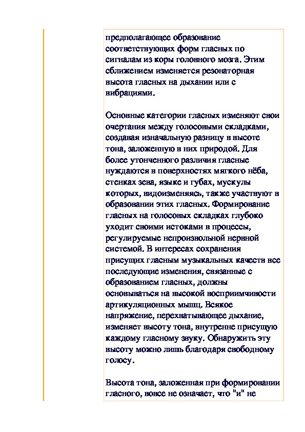 Основные категории гласных изменяют свои очертания между голосовыми складками, создавая изначальную разницу в высоте тона, заложенную в них природой. Для более утонченного различия гласные нуждаются в поверхностях мягкого нёба, стенках зева, языке и губах, мускулы которых, видоизменяясь, также участвуют в образовании этих гласных. Формирование гласных на голосовых складках глубоко уходит своими истоками в процессы, регулируемые непроизвольной нервной системой. В интересах сохранения присущих гласным музыкальных качеств все последующие изменения, связанные с образованием гласных, должны основываться на высокой восприимчивости артикуляционных мышц. Всякое напряжение, перехватывающее дыхание, изменяет высоту тона, внутренне присущую каждому гласному звуку. Обнаружить эту высоту можно лишь благодаря свободному голосу.