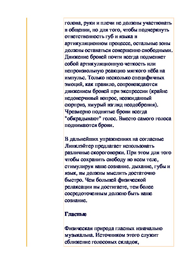 Голос, приобретая свободу, умаляет необходимость специфической работы над гласными. Поэтому Линклэйтер не стала здесь развивать всю серию упражнений, направленных на образование гласных.