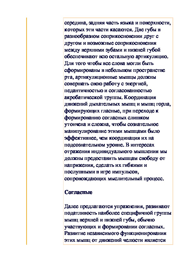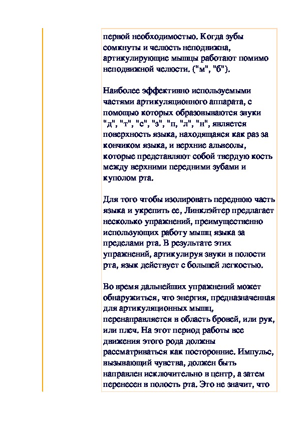 Следующий раздел, посвященный артикуляции, предполагает наиболее экономичное использование артикуляционной мускулатуры. С подвижностью губ и языка приходит свобода от привычных зажимов в артикуляционных мышцах. Существует один критерий для ясной речи - это ясное мышление.