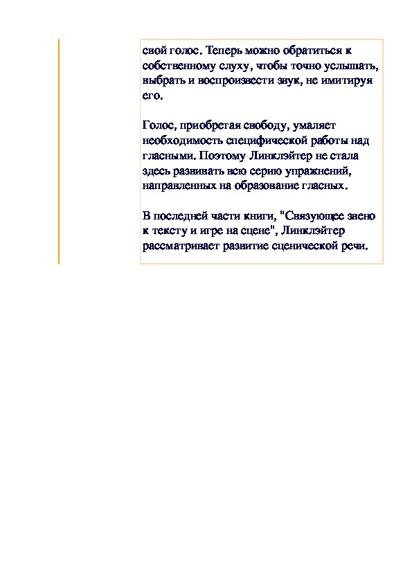 В последней части книги, "Связующее звено к тексту и игре на сцене", Линклэйтер рассматривает развитие сценической речи.