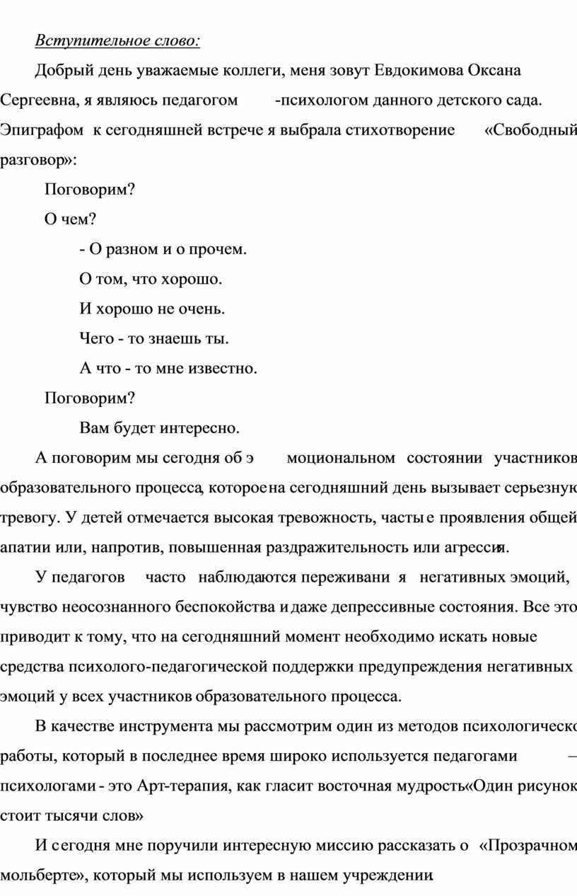 Добрый день уважаемые коллеги, меня зовут Евдокимова Оксана Сергеевна, я являюсь педагогом-психологом данного детского сада. Эпиграфом к сегодняшней встрече я выбрала стихотворение «Свободный разговор»:
