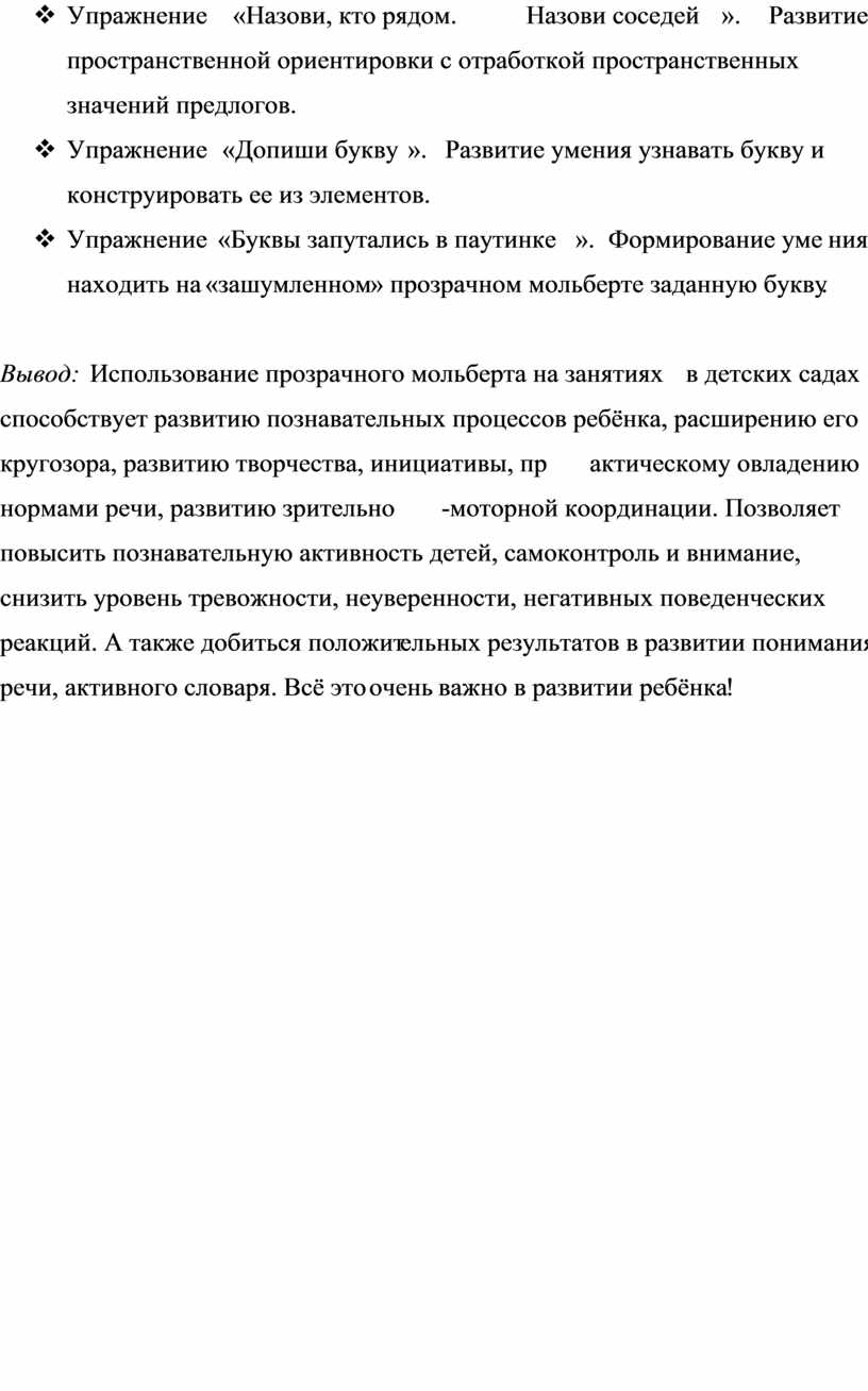 Вывод: Использование прозрачного мольберта на занятиях в детских садах способствует развитию познавательных процессов ребёнка, расширению его кругозора, развитию творчества, инициативы, практическому овладению нормами речи, развитию зрительно-моторной координации. Позволяет повысить познавательную активность детей, самоконтроль и внимание, снизить уровень тревожности, неуверенности, негативных поведенческих реакций. А также добиться положительных результатов в развитии понимания речи, активного словаря. Всё это очень важно в развитии ребёнка!