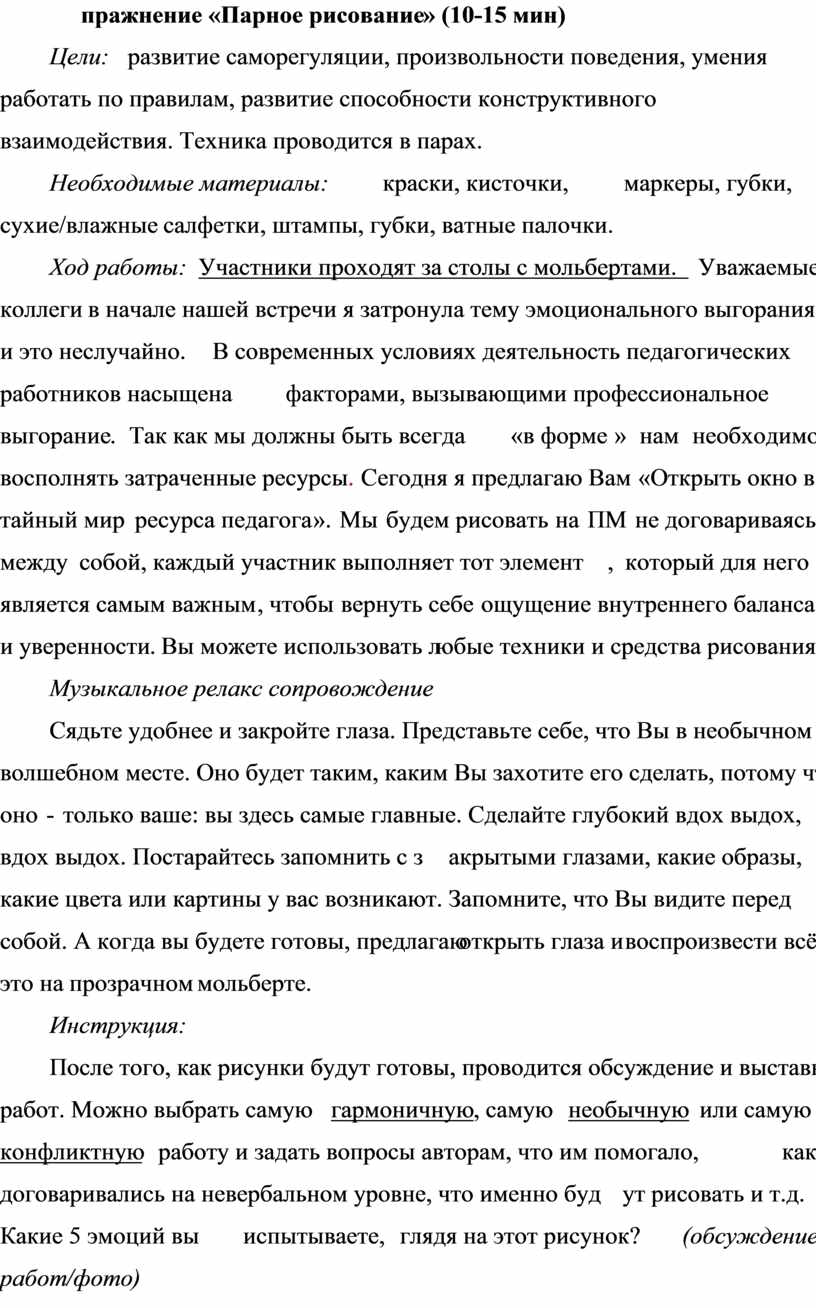 Ход работы: Участники проходят за столы с мольбертами. Уважаемые коллеги в начале нашей встречи я затронула тему эмоционального выгорания и это неслучайно. В современных условиях деятельность педагогических работников насыщена факторами, вызывающими профессиональное выгорание. Так как мы должны быть всегда «в форме» нам необходимо восполнять затраченные ресурсы. Сегодня я предлагаю Вам «Открыть окно в тайный мир ресурса педагога». Мы будем рисовать на ПМ не договариваясь между собой, каждый участник выполняет тот элемент, который для него является самым важным, чтобы вернуть себе ощущение внутреннего баланса и уверенности. Вы можете использовать любые техники и средства рисования.