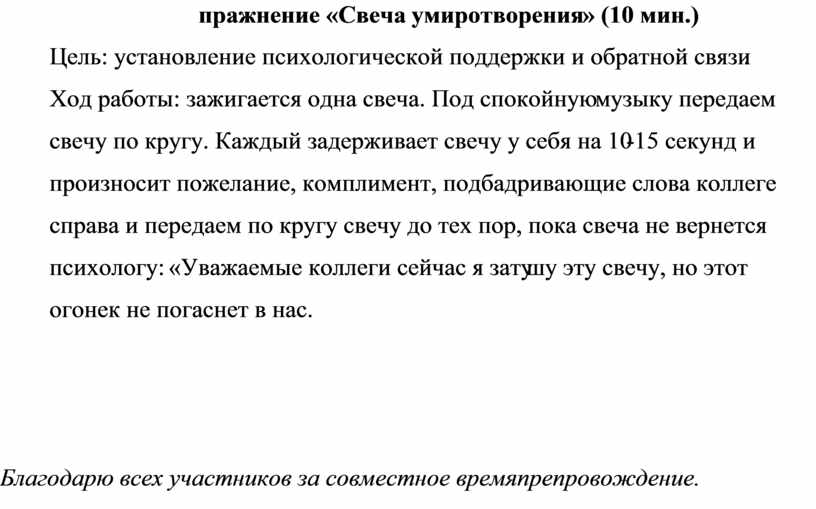 Ход работы: зажигается одна свеча. Под спокойную музыку передаем свечу по кругу. Каждый задерживает свечу у себя на 10-15 секунд и произносит пожелание, комплимент, подбадривающие слова коллеге справа и передаем по кругу свечу до тех пор, пока свеча не вернется психологу: «Уважаемые коллеги сейчас я затушу эту свечу, но этот огонек не погаснет в нас.