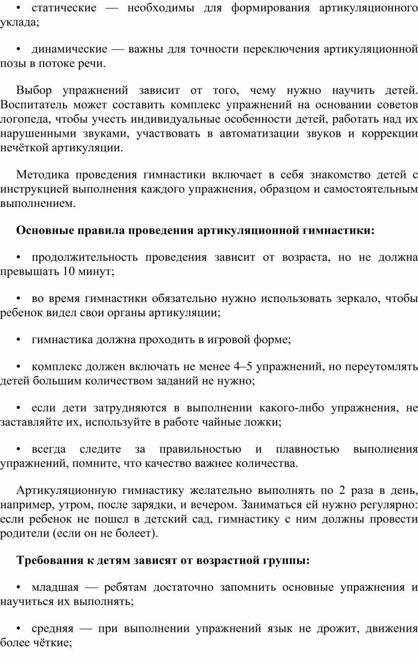 Артикуляционная гимнастика может проводиться в группах, микро-группах или индивидуально. В групповой форме гимнастику можно провести утром после зарядки, перед завтраком. В микро-группах и индивидуально её обычно проводит логопед или родители. Артикуляционные упражнения бывают: