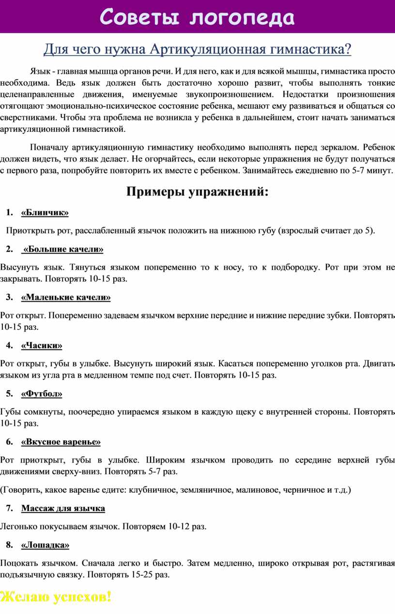 Язык - главная мышца органов речи. И для него, как и для всякой мышцы, гимнастика просто необходима. Ведь язык должен быть достаточно хорошо развит, чтобы выполнять тонкие целенаправленные движения, именуемые звукопроизношением. Недостатки произношения отягощают эмоционально-психическое состояние ребенка, мешают ему развиваться и общаться со сверстниками. Чтобы эта проблема не возникла у ребенка в дальнейшем, стоит начать заниматься артикуляционной гимнастикой.