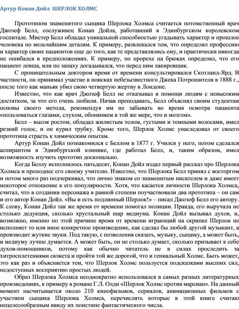 Артур Конан Дойл познакомился с Беллом в 1877 г. Учился у него, потом сделался аспирантом в Эдинбургской клинике, где работал Белл, и, таким образом, имел возможность изучить прототип досконально.