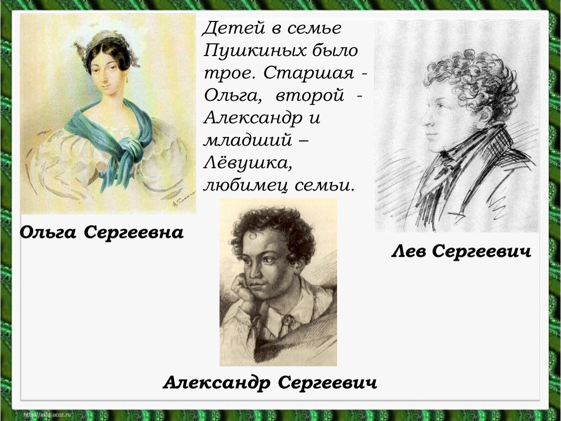 Детей в семье Пушкиных было трое. Старшая -Ольга, второй - Александр и младший – Лёвушка, любимец семьи.