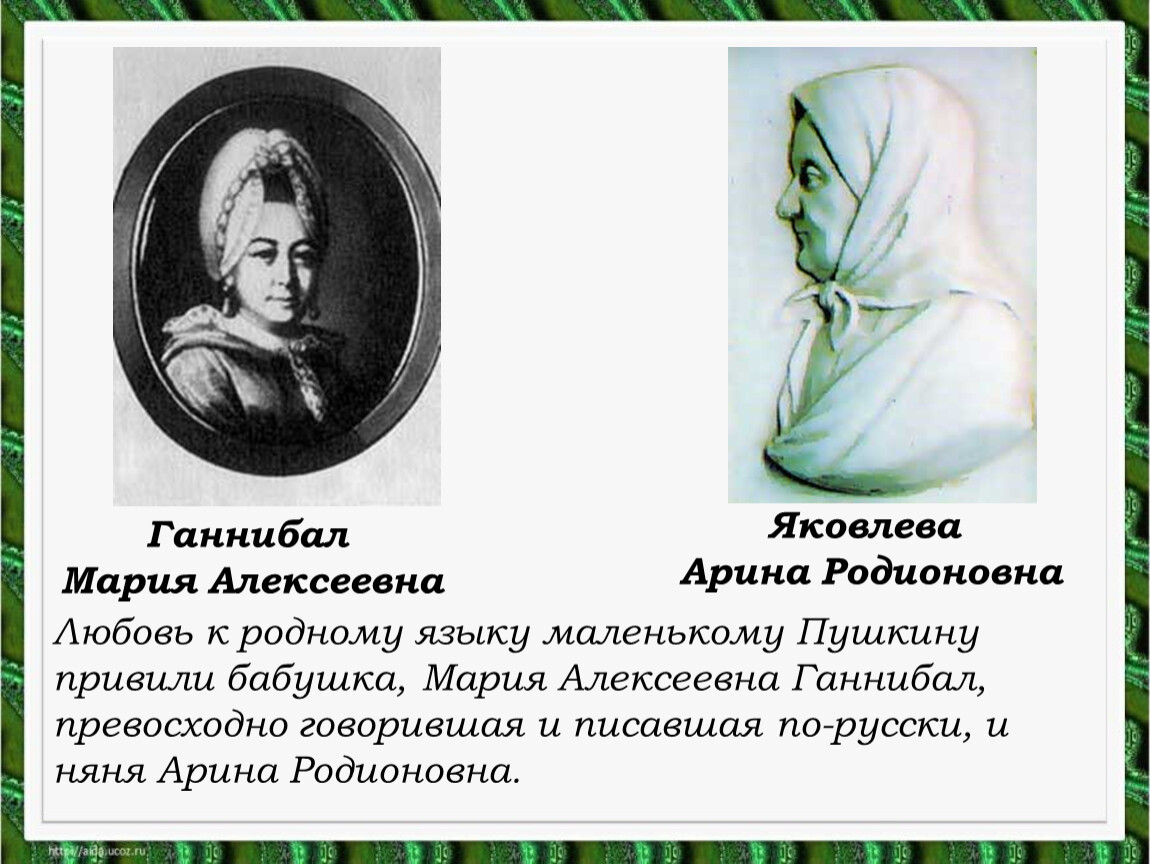 Любовь к родному языку маленькому Пушкину привили бабушка, Мария Алексеевна Ганнибал, превосходно говорившая и писавшая по-русски, и